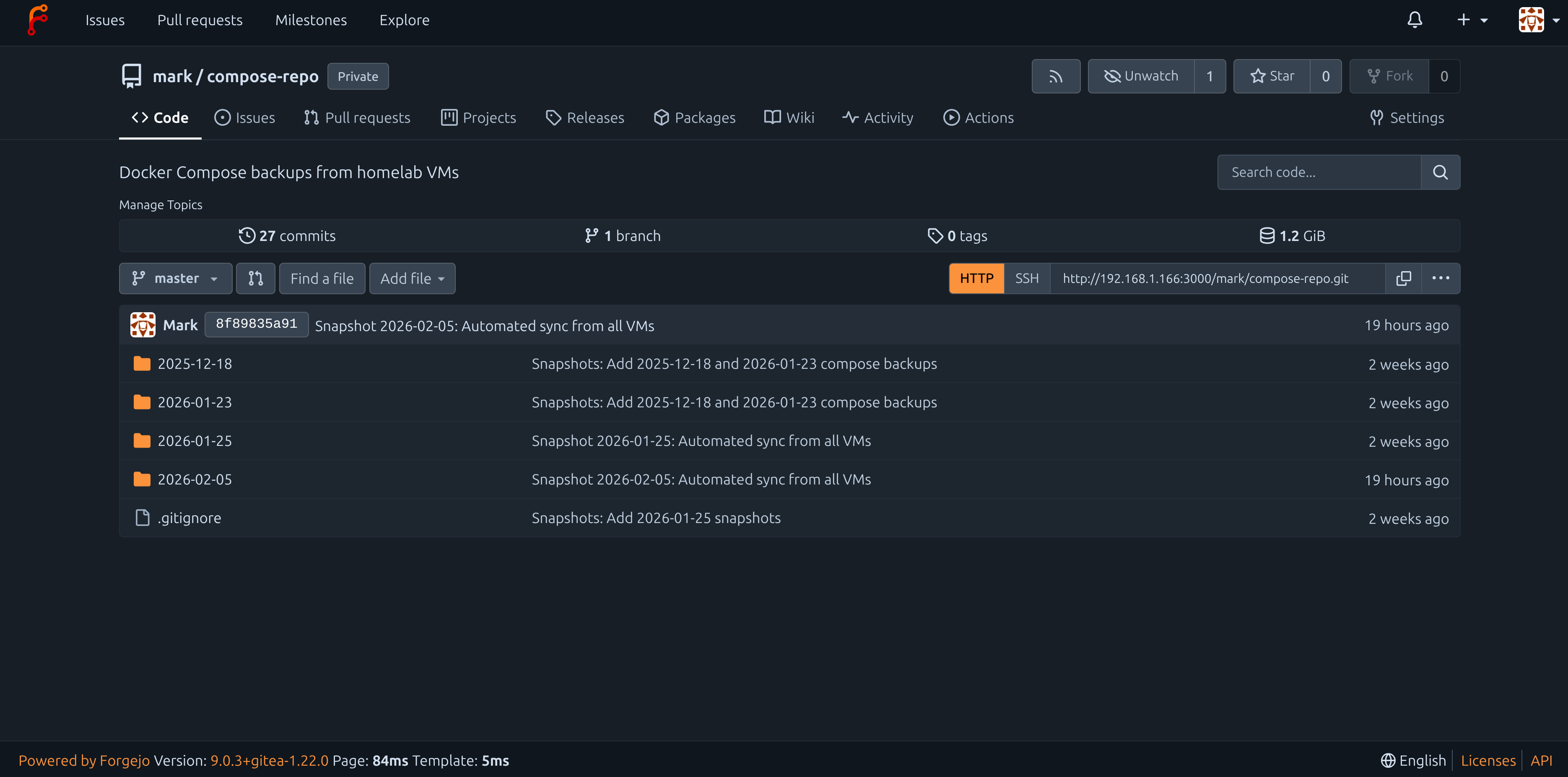 A bare Git repository stores version history but provides no way to easily browse files or view changes without command-line tools. Forgejo solves this by providing a web interface where you can click through your repository’s file structure, view any commit’s changes with color-coded diffs, search across files, and see your repository’s activity timeline. For infrastructure backups like Docker Compose files, this means you can quickly find that working configuration from three months ago or see exactly what changed between two backup snapshots without running a series of Git commands.